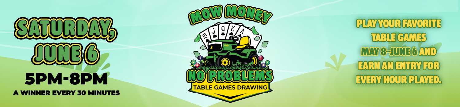 The Mow Money, No Problems Table Games Drawing will take place only in the table games area. Lucky Star Rewards players will earn drawing tickets by playing tracked hours on any table games on any day between May 8 to June 6, 2026. Guests will receive one (1) ticket per tracked hour of play. They will then place their entries into a drawing drum for a chance to win promotional chips and a chance to win one of two grand prizes… A Toro Super Recycler or a John Deere S100 Ride on Mower.