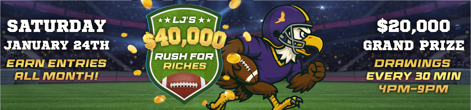 Earn entries throughout the month of January, starting New Years Day. Then come back in on Saturday, January 24, 2026 from 4pm-9pm where we will be drawing a prize every 30 minutes with a chance to win $20,000 cash at 9pm.
